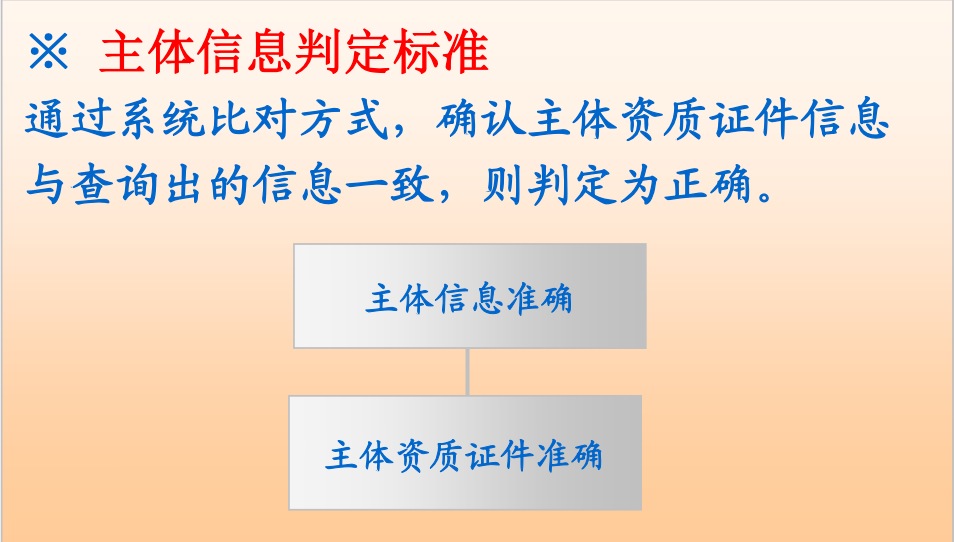 通過系統(tǒng)比對,確認(rèn)主體名稱和證件號碼與查詢出的信息一致,則判定正確。