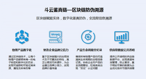 當(dāng)前,商品防偽領(lǐng)域存在著防偽技術(shù)市場混亂,高端產(chǎn)品價格過高,低端防偽技術(shù)不具備唯一性,防偽標(biāo)識不易被消費(fèi)者識別且容易被造假等顯著市場痛點(diǎn)。商品防偽一直是廣大制造類企業(yè)、特別是實(shí)體制造類企業(yè)難以回避的困擾,也是習(xí)近平總書記此次講話中,未來區(qū)塊鏈技術(shù)重點(diǎn)應(yīng)用方向之一。那么,使用了區(qū)塊鏈技術(shù)的斗云鑒真鏈在商品防偽方面能給企業(yè)帶來哪些價值呢?